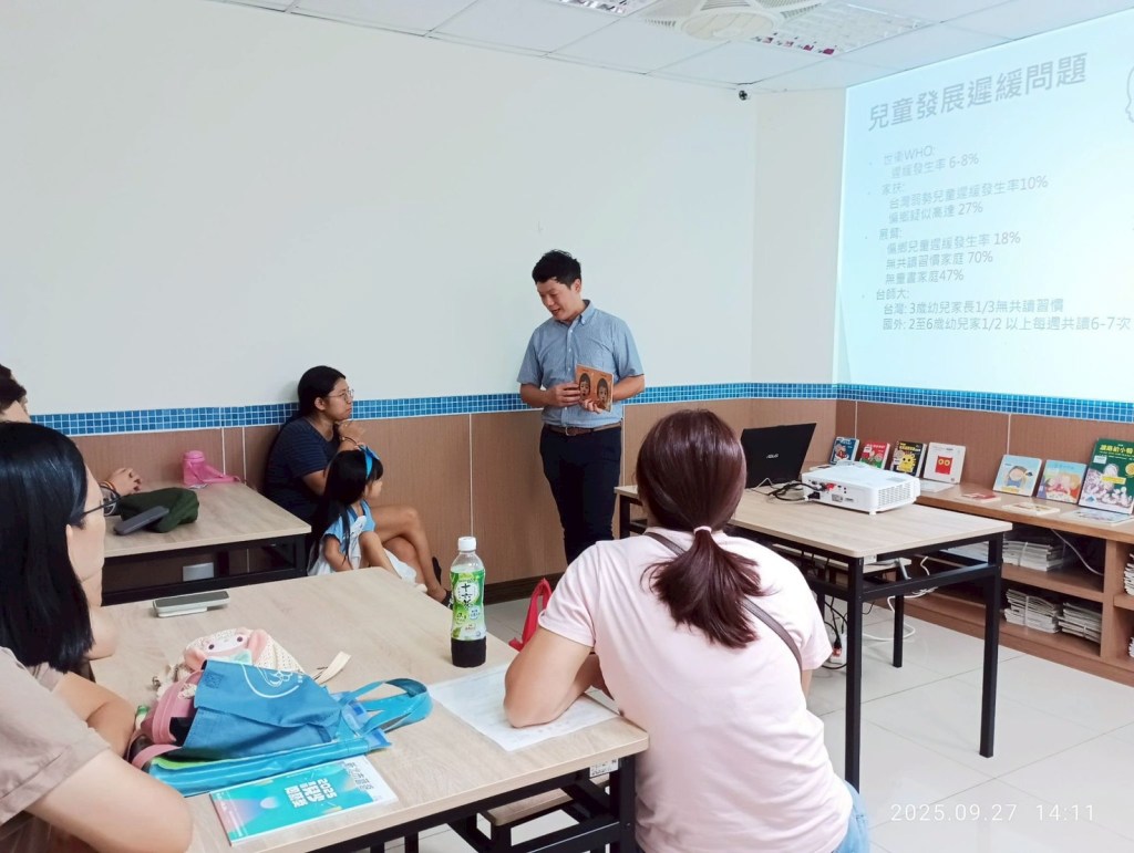 推廣嬰幼兒閱讀的列出來到新北市圖青少年圖書館,展臂閱讀陳宥達理事長親自向家長分享如何在孩童不同成長階段,選對繪本、讀出生活共鳴,讓共讀真正貼近孩子的生活與發展節奏。