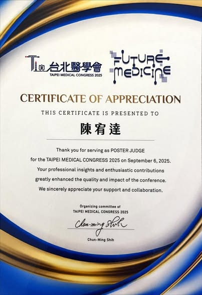 很榮幸受邀擔任今年 2025 Taipei Medical Congress 壁報論文(Poster Session)評審,在眾多優秀研究者的創新成果中交流、學習,也再次見證台灣臨床研究與醫療創新的驕傲。