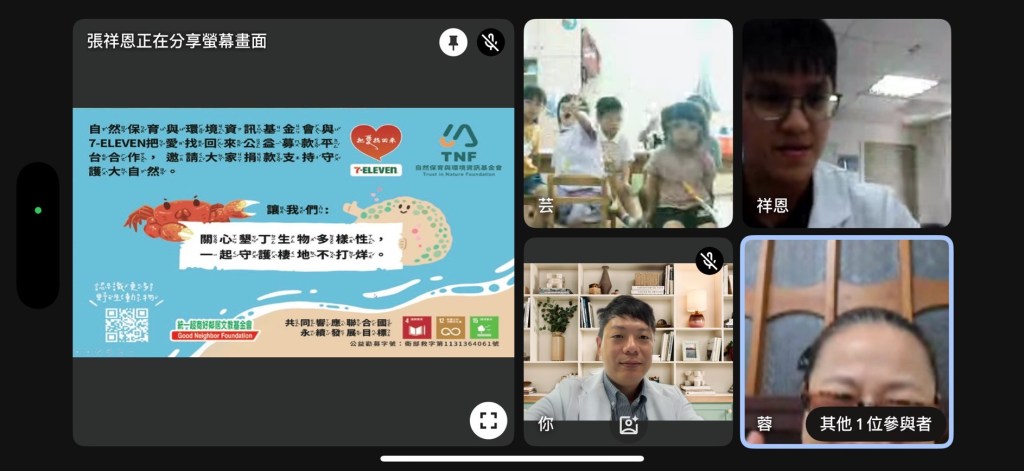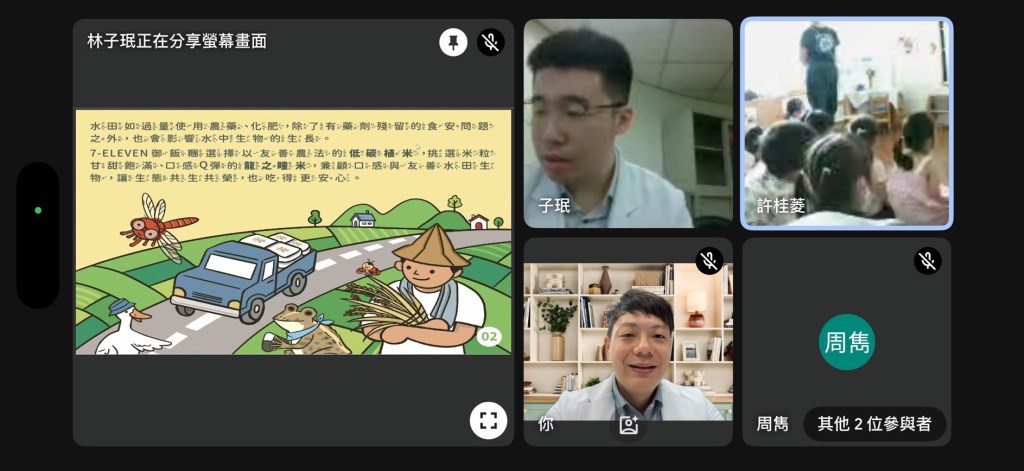 新學期一開始,團隊透過遠距共讀,串連澎湖西嶼的兩所幼兒園,以及嘉義市衛生局銀髮志工,進行三方共讀。課程中運用 統一超商永續手掌繪本《稻田裡的生物派對》 與 《墾丁的生物多樣性──陸蟹及珊瑚篇》,帶領孩子與長輩一同走進生態故事的世界。
