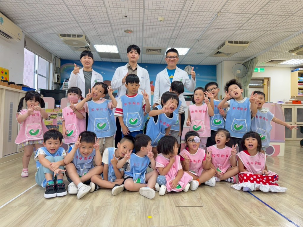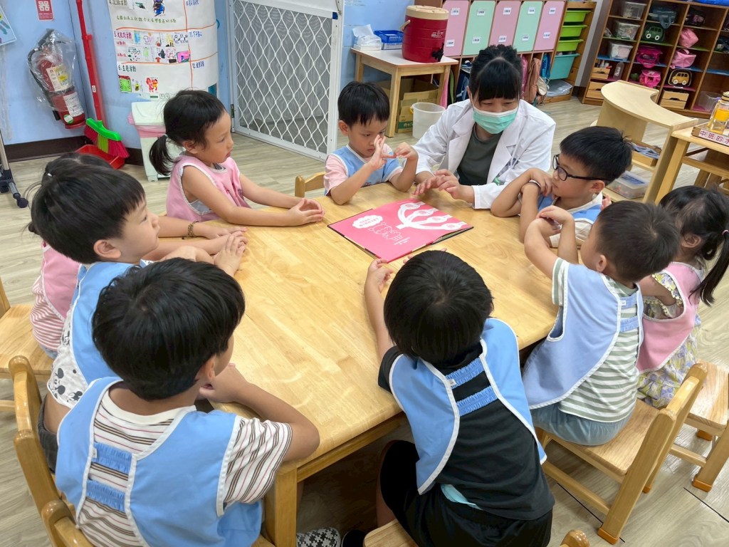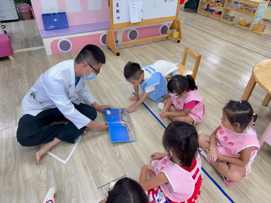 接著,醫師們與大班孩子共讀口腔健康與日常清潔主題繪本,透過生動的故事與問答互動,引導孩子在歡笑中學習健康知識。孩子們的好奇與專注,讓現場充滿學習與關懷的能量。