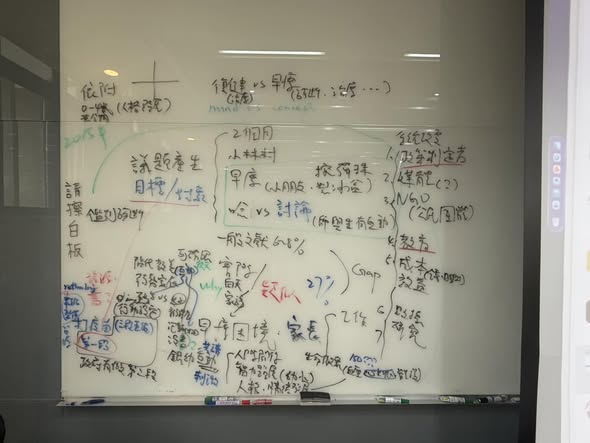 白板上留下與共同授課老師宗良老師、同學們激盪的筆記,圍繞著早療與社會公義的深刻討論: