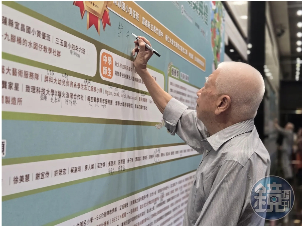 社區一家評審長柴松林特地為社區一家得獎者背板簽名致意。(攝影/林沛縈)