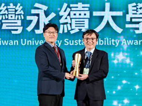 教育部次長朱俊彰(左)頒發台灣永續大學獎予本校吳麥斯校長(右)