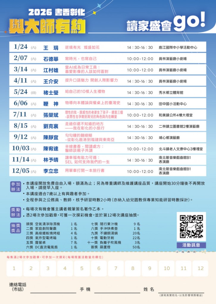 好康的是,民眾參加講座可抽講師簽名書,全程參與的公務員、教師核2小時研習時數。參加2場次就有摸彩機會,獎品包括空氣清淨除濕機、家庭劇院聲霸、高級鐵板燒組等豐富獎品,將於12月5日第12場抽出。詳情上文化局網站「最新消息」查詢,歡迎走訪彰化聽大師故事。