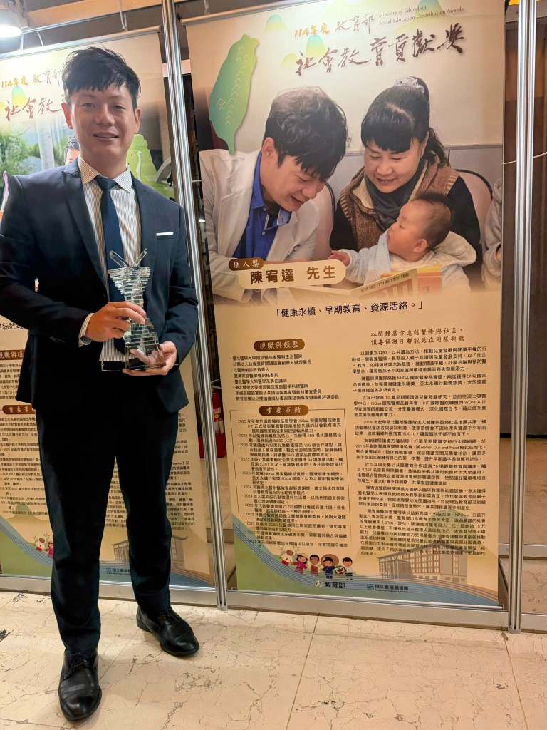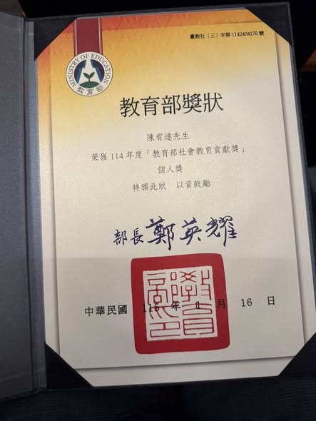 今年獲得的「教育部社會教育貢獻獎」,自民國 66 年起辦理,是教育部歷史最悠久的獎項之一。獎項分為終身奉獻獎、個人獎與團體獎,表揚長期投入社會教育實踐者。