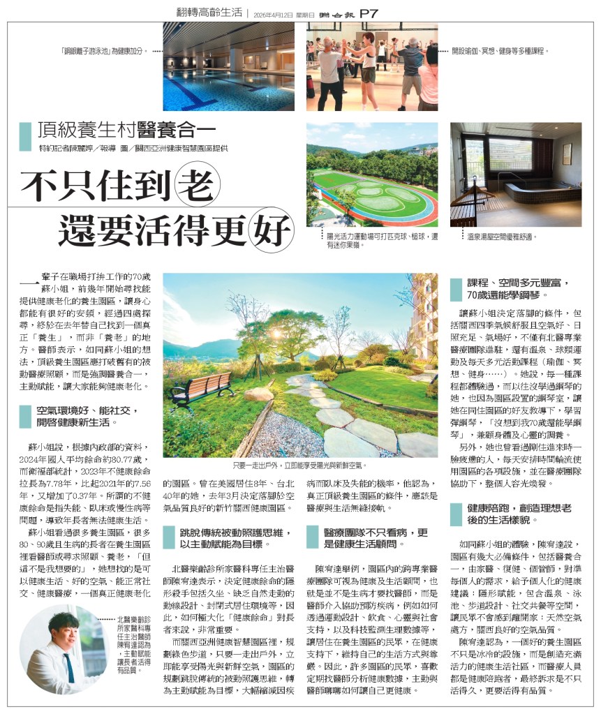 一輩子在職場打拚工作的70歲蘇小姐,前幾年開始尋找能提供健康老化的養生園區,讓身心都能有很好的安頓,經過四處探尋,終於在去年替自己找到一個真正「養生」,而非「養老」的地方。醫師表示,如同蘇小姐的想法,頂級養生園區應打破舊有的被動醫療照顧,而是強調醫養合一,主動賦能,讓大家能夠健康老化。